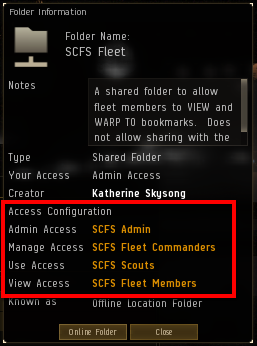 OPSEC is an ever present mission - especially when running a fleet. To help cut down on OPSEC holes we have created 5 FOD ACLs. The names are self descriptive and come into play for the setup of the folders. For now, let it suffice that a FC has several ACLs they can add fleet members to. And hopefully, it will make more sense when we look at shared folder setup!