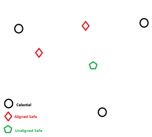 A "Safe" is a spot somewhere in the system that is not easily warpable to (the Sun at 0 or 100km is a bad safe spot). There are two main types of safes; aligned and unaligned. An aligned safe is on a line between two warpable points (often celestials or gates). To create aligned Safes, warp between two objects and drop bookmarks (Shortcut Ctrl+B) along the way. Another player may find you in an aligned Safe by warping between the same objects and using D-scan (if you are not cloaked).